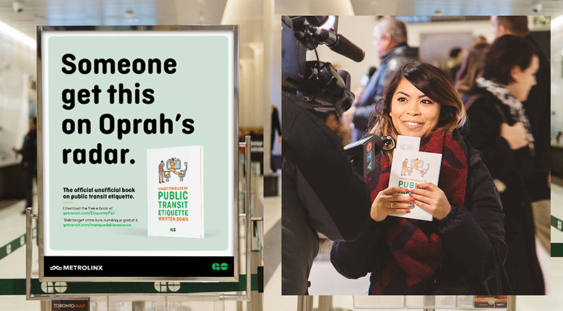 GO Transit's Guide to Etiquette campaign was developed to raise awareness of good behaviour and courtesy among passengers. It was created using actual commuter tweets for source content. The campaign aimed to encourage travellers to be more mindful of their actions and behaviours while traveling by train or bus. The campaign included posters, flyers, and social media posts that highlighted important etiquette tips such as giving up seats for elderly or disabled passengers, not blocking doors or aisles, and keeping one's phone conversations and music volumes to a minimum. The campaign also emphasized the importance of respecting other passengers' personal space and belongings. GO Transit hoped that the campaign would create a more positive and enjoyable travel experience for all its passengers.